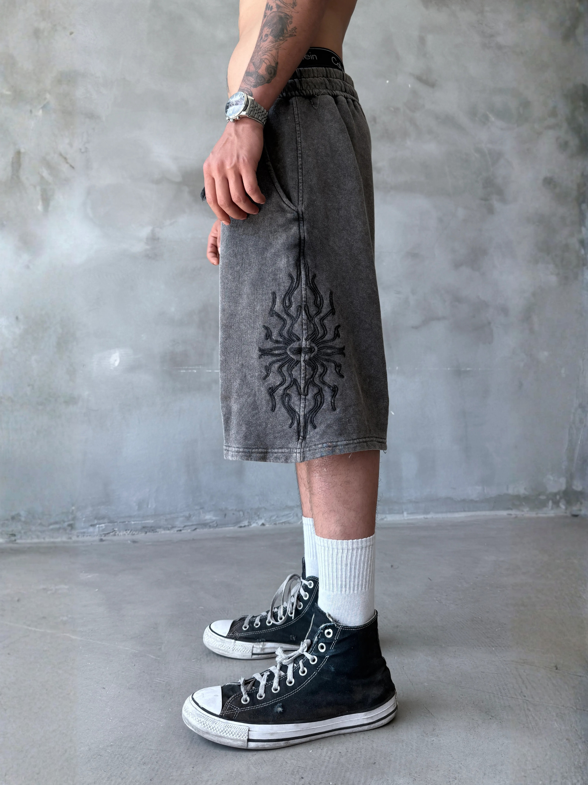 Step into dark minimal street energy with the Dark Halo Shorts where vintage wash textures meet bold symbolic design. Set on a faded charcoal base, the shorts feature a striking black halo emblem radiating from the side panel, creating a sharp yet understated statement.